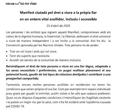 Les persones i les entitats que signem aquest Manifest, compromeses amb els valors de la dignitat humana, la fraternitat i la llibertat, defensem el dret universal a viure de manera independent i a ser inclòs a la comunitat. Així ho diu la Convenció aprovada per les Nacions Unides. Tota persona ha de poder: