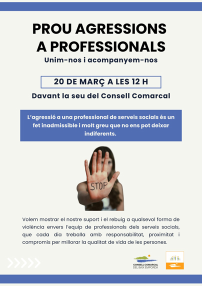 Des del CEESC donem suport al Manifest de rebuig davant l'agressió a una professional dels Serveis Socials Bàsics, que han difòs des de l’Àrea Bàsica de Serveis Socials del Consell Comarcal del Baix Empordà, així com a l'acte de rebuig que tindrà lloc el proper divendres, 20 de març davant del Consell Comarcal del Baix Empordà