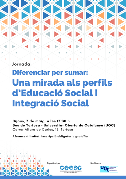El proper 7 de maig a les 17.30h, la seu de la UOC de Tortosa acollirà una jornada que, a més de generar debat professional, servirà per presentar a nivell nacional el document del CEESC “Diferències entre els professionals de l’Educació Social i els de la Integració Social”.